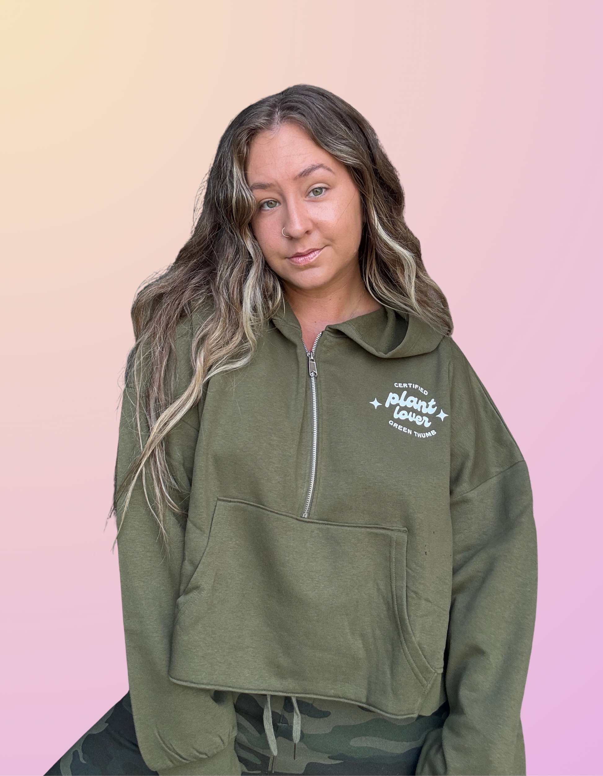 Olive half-zip cropped hoodie, white "Certified Plant Lover" logo.