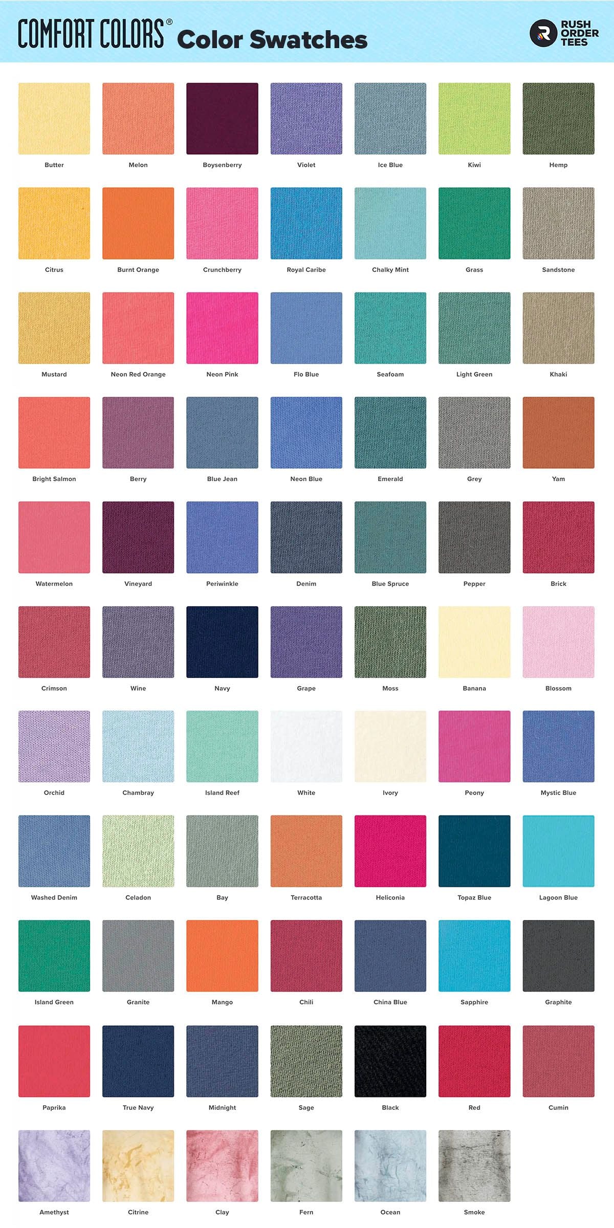 - Tees are Comfort Colors (100% preshrunk cotton) brand for reference, and crewnecks and hoodies are Gildan Heavy Blend (80/20 cotton/polyester).