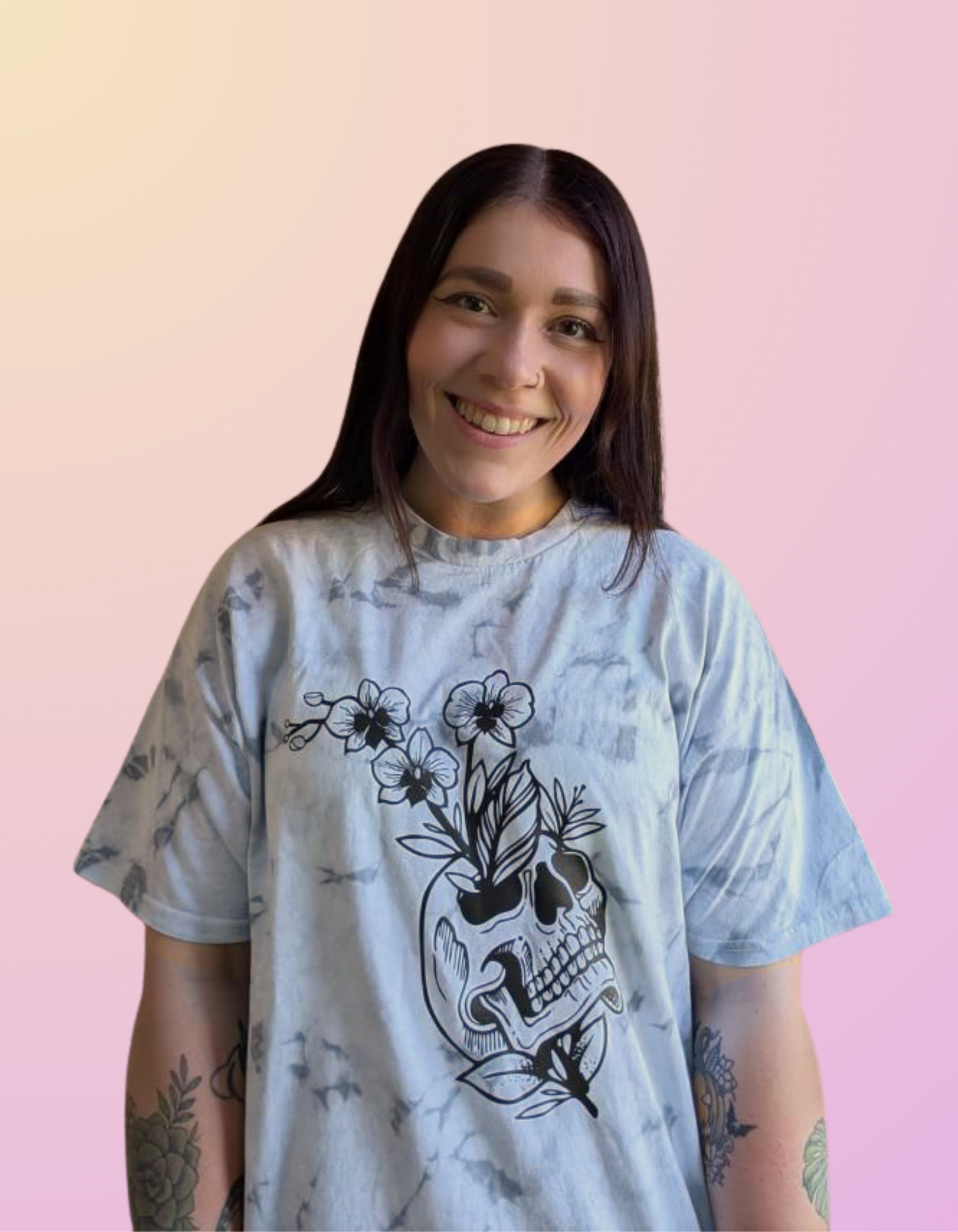 Crystal dye silver tee, black "Orchid Skull" logo.