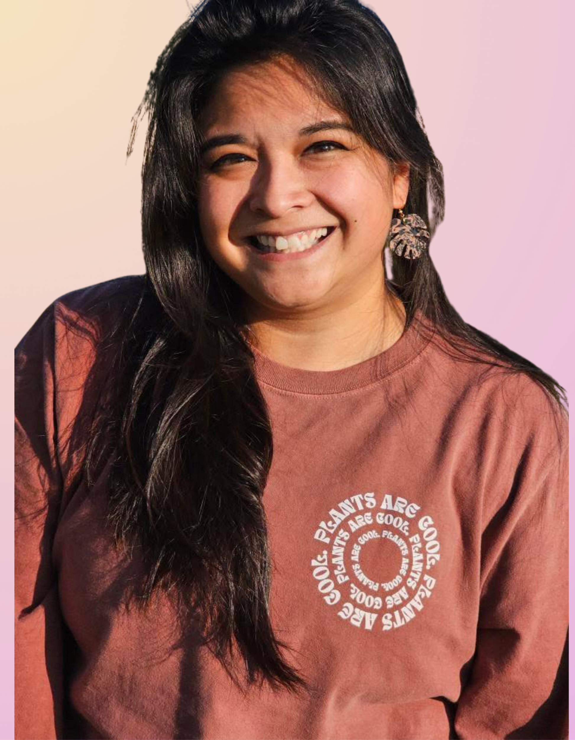 Washed chestnut, long sleeve shirt, white "Plants Are Cool" logo. The PERFECT fall color!